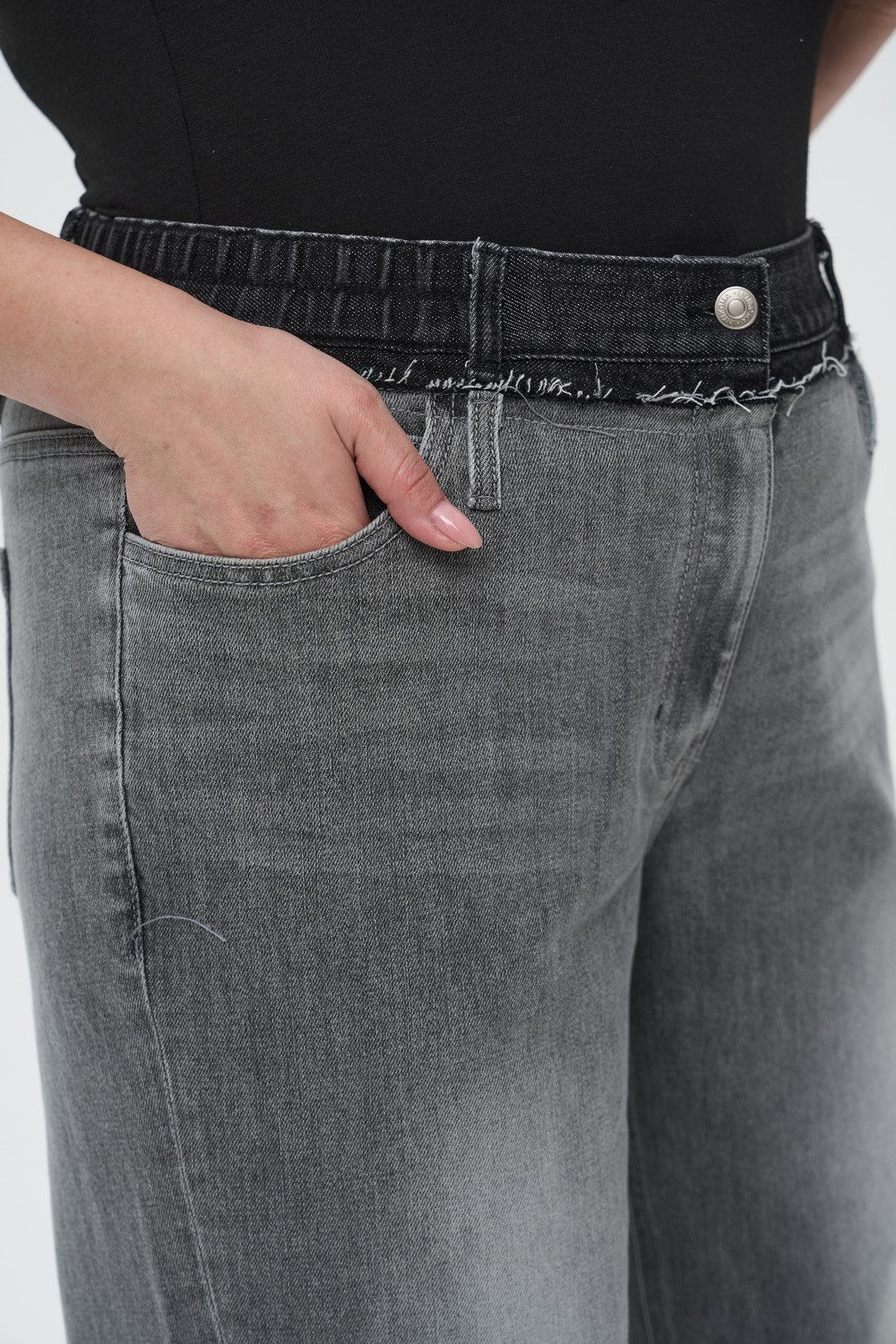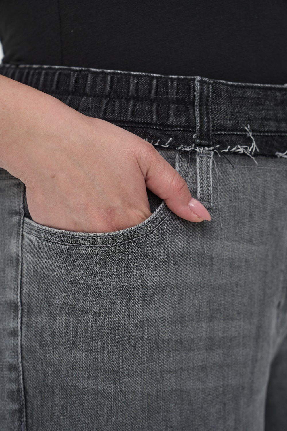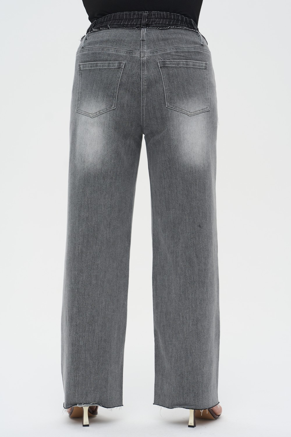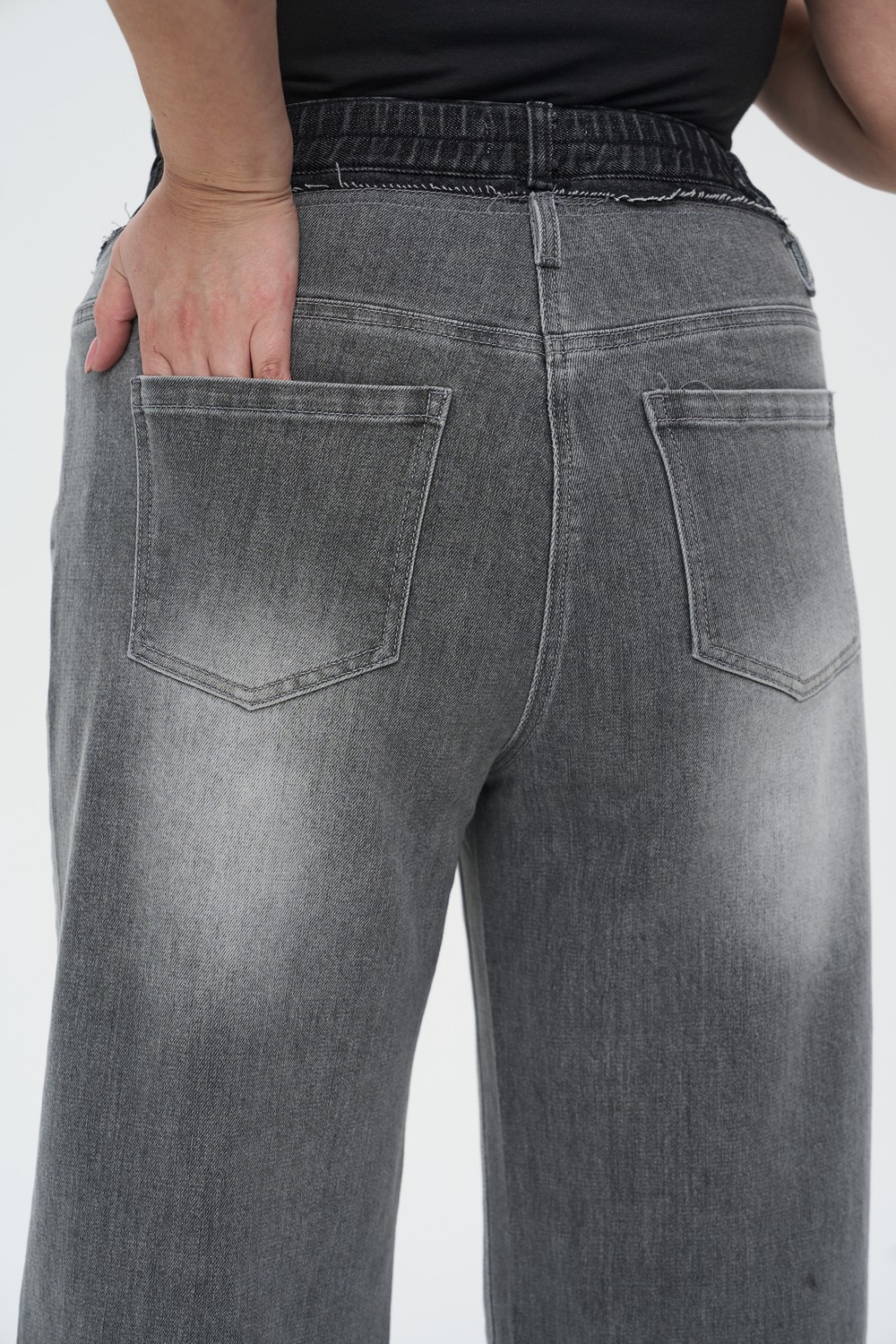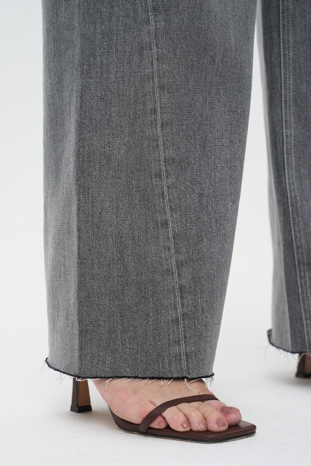 • Нижний край: Необработанный срез с легкой бахромой придает модели непринужденный вид.