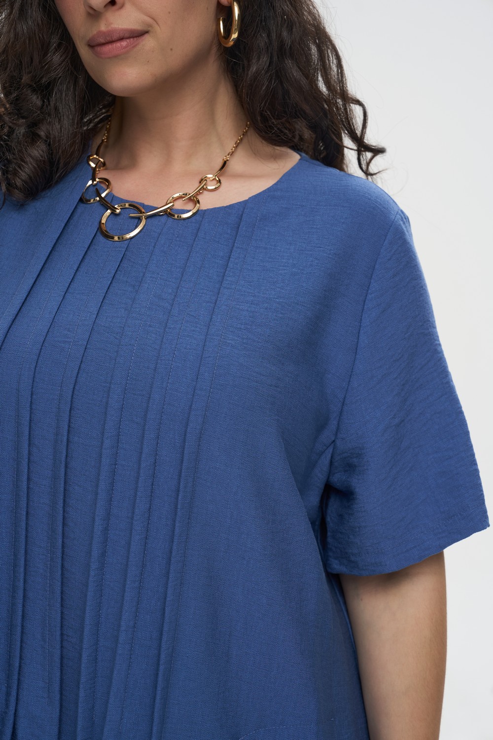 • Вырез: Лаконичная круглая горловина, оформленная мягкими сборками.