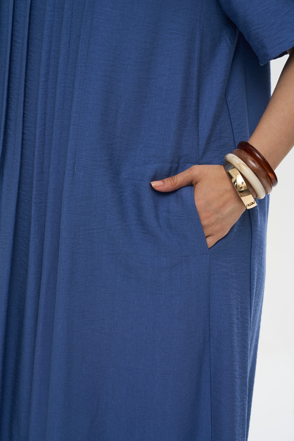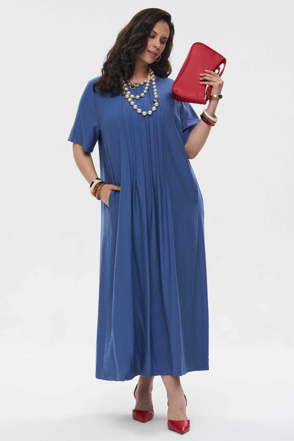 • Детали: Глубокие встречные складки по центру полочки создают красивый вертикальный акцент и дополнительный объем, придавая образу архитектурность.