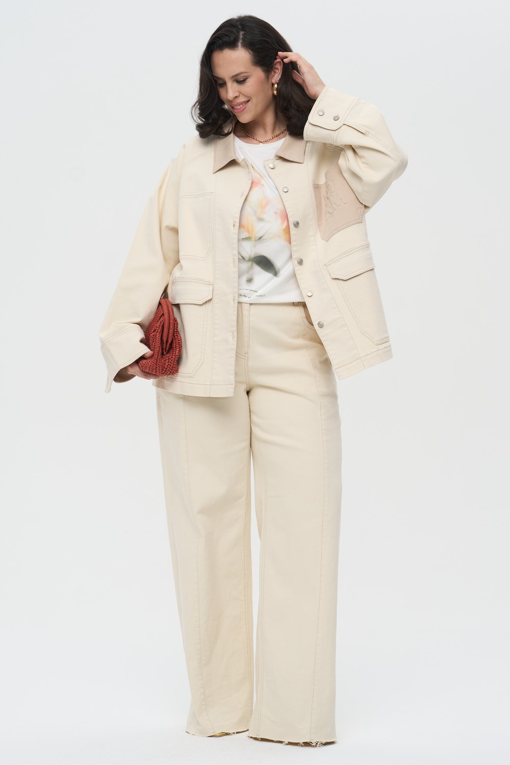 Джинсы «Хайла» великолепно работают в монохромных комплектах с жакетом «Мара» из аналогичной ткани, создавая завершенный и стильный костюм. Они также гармонично сочетаются с базовыми белыми футболками или легкими блузами с принтом. Благодаря универсальному крою, модель одинаково хорошо смотрится как с обувью на плоском ходу, так и с элегантными ботильонами или туфлями на каблуке.