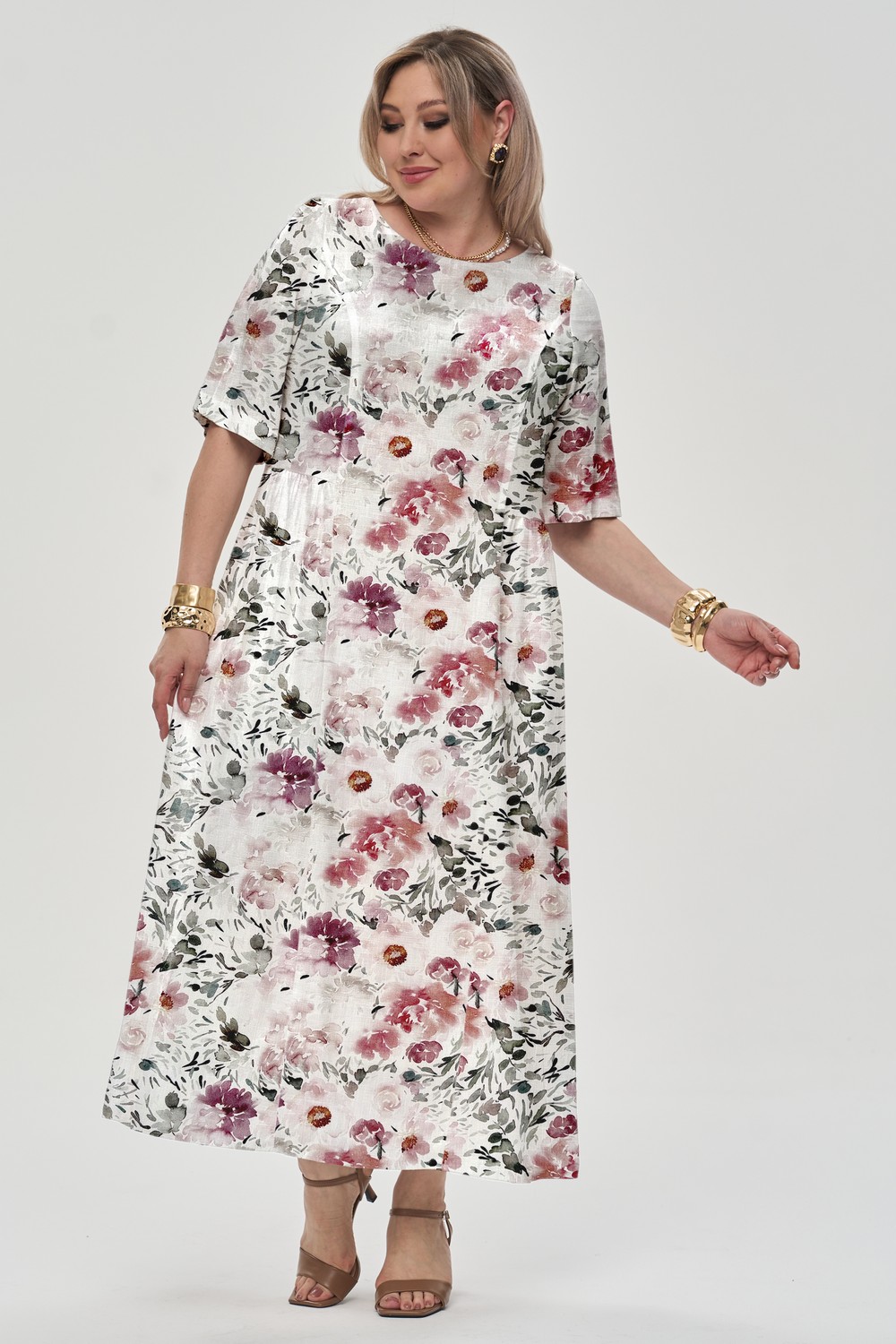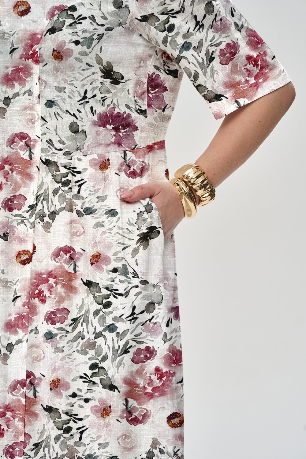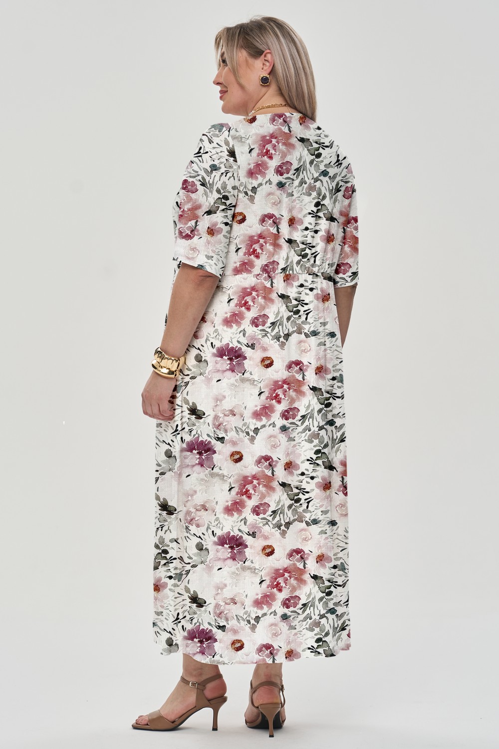 Элегантное платье свободного силуэта с живописным цветочным принтом — идеальный выбор для создания утонченного летнего образа. Модель выполнена из высококачественного смесового полотна на основе хлопка (55%) и льна (45%), что обеспечивает исключительный комфорт, гигроскопичность и прохладу в жаркие дни. Натуральная фактура ткани в сочетании с изысканным рисунком в розово-зеленой гамме подчеркивает благородство и стиль изделия.