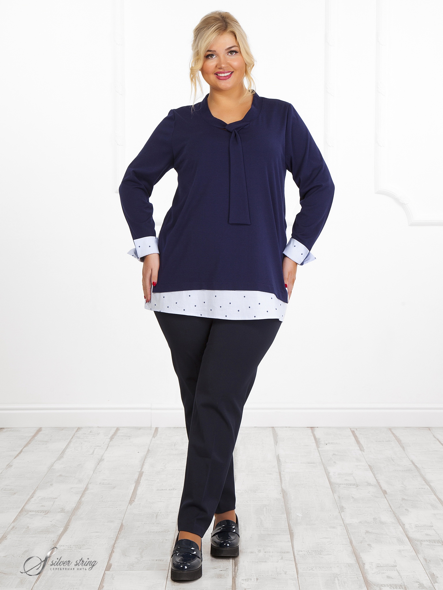 Трикотажная блуза прямого силуэта. В модели используется два вида ткани. Основная - трикотаж, компаньон – текстиль. Стиль повседневный. Рукав втачной, длинный, низ обработан манжетой из ткани компаньона, как и вставка по низу изделия. Горловина украшена фантазийным воротником. Стильный образ достигается тем, что модель имитирует сочетания двух моделей, трикотажного джемпера и рубашки.