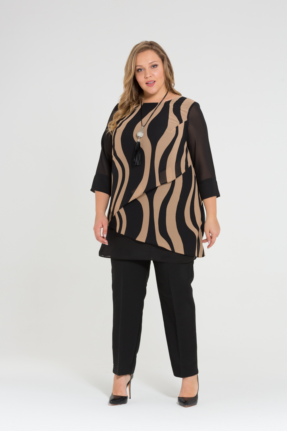 Туника свободного силуэта из многослойного шифона со стрейч-эффектом в классическом сочетании бежевого с черным прекрасно дополнит как повседневный, так и вечерний образ. Легкий однослойный рукав длиной 3/4 из шифона с манжетом отлично садится по фигуре. Модель без застежки.