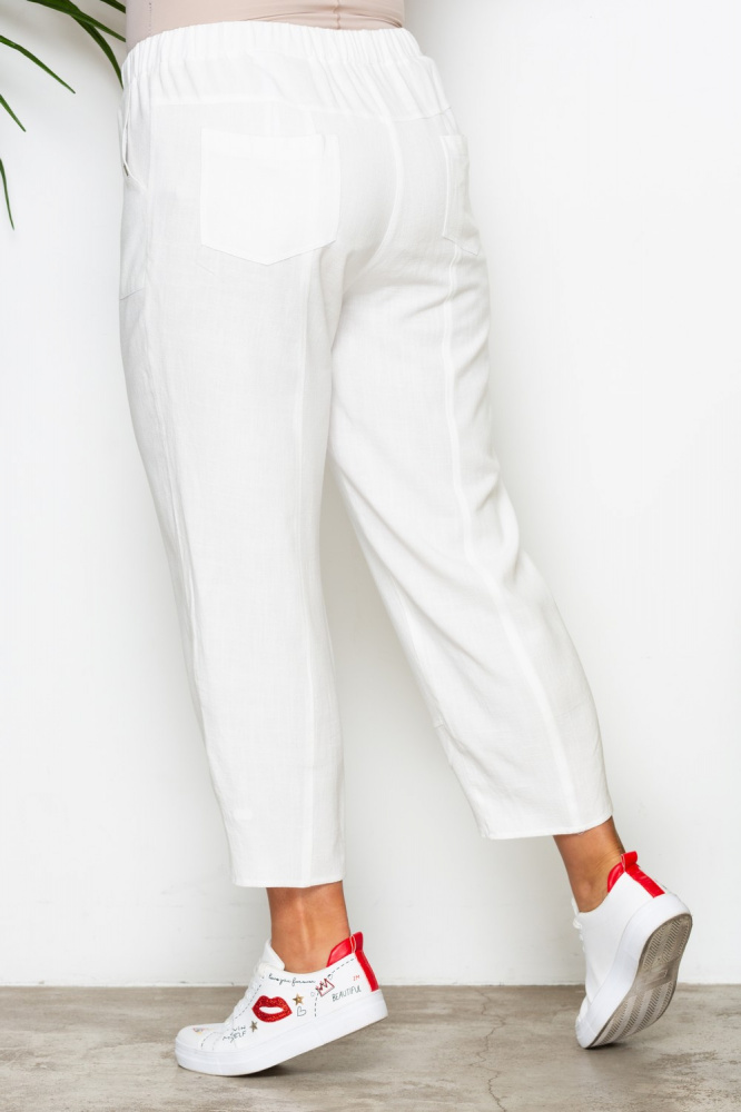 Стильные брючки-«бананы» – выбор для тех, кто предпочитает удобную и в то же время оригинальную одежду. Вискозная ткань с добавлением льна гарантирует приятное соприкосновение с телом и комфорт в носке. Поверхность ткани будто слегка крэширована, с естественной для натуральных волокон «мятостью» и неравномерной толщиной льняной нити (slab-эффект). Модель без застежки, легко одевается и замечательно сидит на талии благодаря эластичному поясу на резинке. На передних половинках и задних имеются накладные карманы. Штанины имеют вертикальные, выгнутой формы рельефы и отрезную конусную нижнюю часть, что придает брюкам оригинальный, смелый имидж в стиле casual. Длина по внутреннему шву 67,5 ширина брючины снизу 20 см