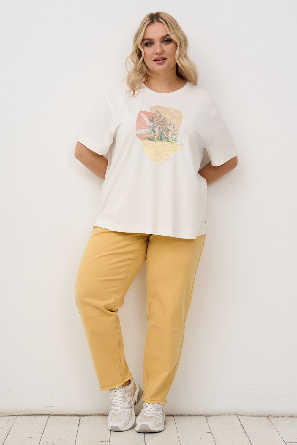 Футболка прямого кроя отлично впишется в ваш повседневный гардероб. Круглый вырез зрительно удлинит шею. Авторский романтичный принт в спокойных тонах будет смотреться женственно и нежно и подойдет как для создания пляжных или городских аутфитов, так и для элегантных или деловых образов в стиле casual. Актуальный прямой силуэт, рукава длиной до локтя и разрезы по низу в боковых швах подарят комфорт и ощущение свободы. На полочке и спинке имеются продольные ассиметричные рельефные защипы, визуально сужающие фигуру. Низ изделия разноуровневый с небольшим перепадом на спинку. Футболка выполнена из вискозного трикотажа молочного цвета. Дышащий, хорошо впитывающий и отводящий влагу натуральный материал комфортен в носке, а благодаря обработке по технологии мерсеризации, он практичен в уходе — отлично сохраняет форму и меньше мнется.