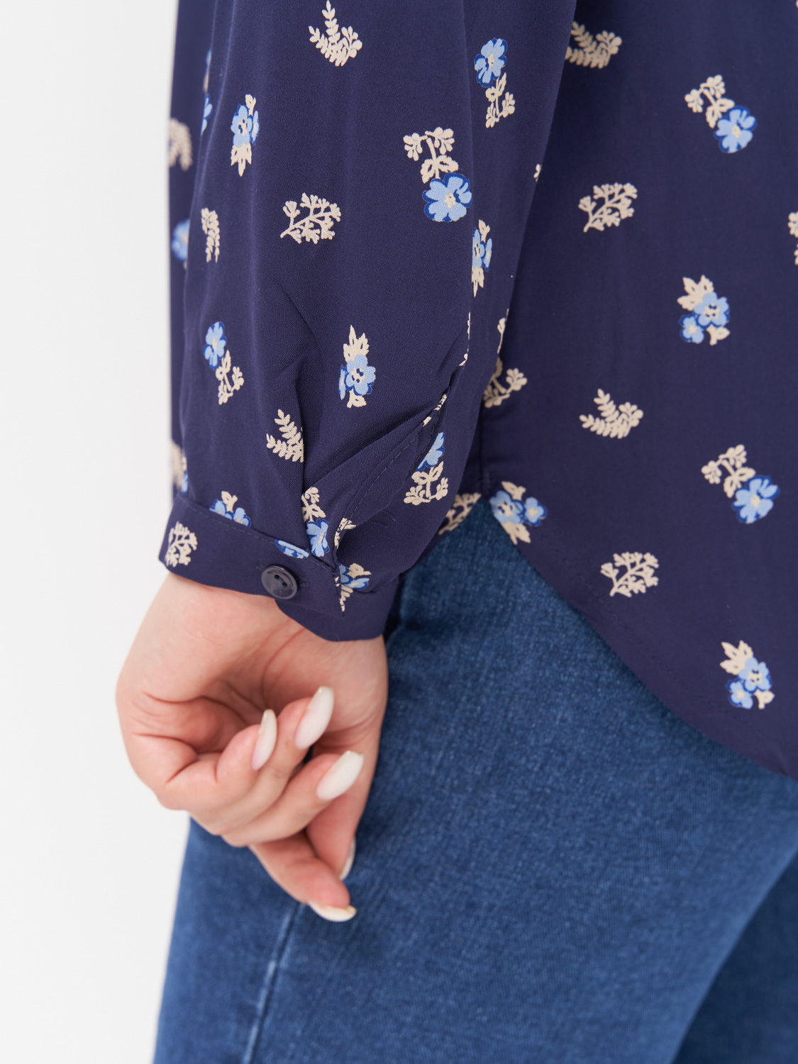 Блузка женская большого размера. Стильная рубашка из высококачественного трикотажного штапеля с нежным цветочным орнаментом. Горловина обработана невысокой стойкой. Спереди на блузке расположена планка с пуговицами. Длинные втачные рукава с рубашечной манжетой по низу. Блузка свободного силуэта, но с помощью тонкого пояска можно подчеркнуть талию. Такой крой подходит для многих типов фигуры, скрывая несовершенства и подчеркивая достоинства. Блузка прекрасно подходит для повседневных образов, для офиса и для нарядных комплектов.
