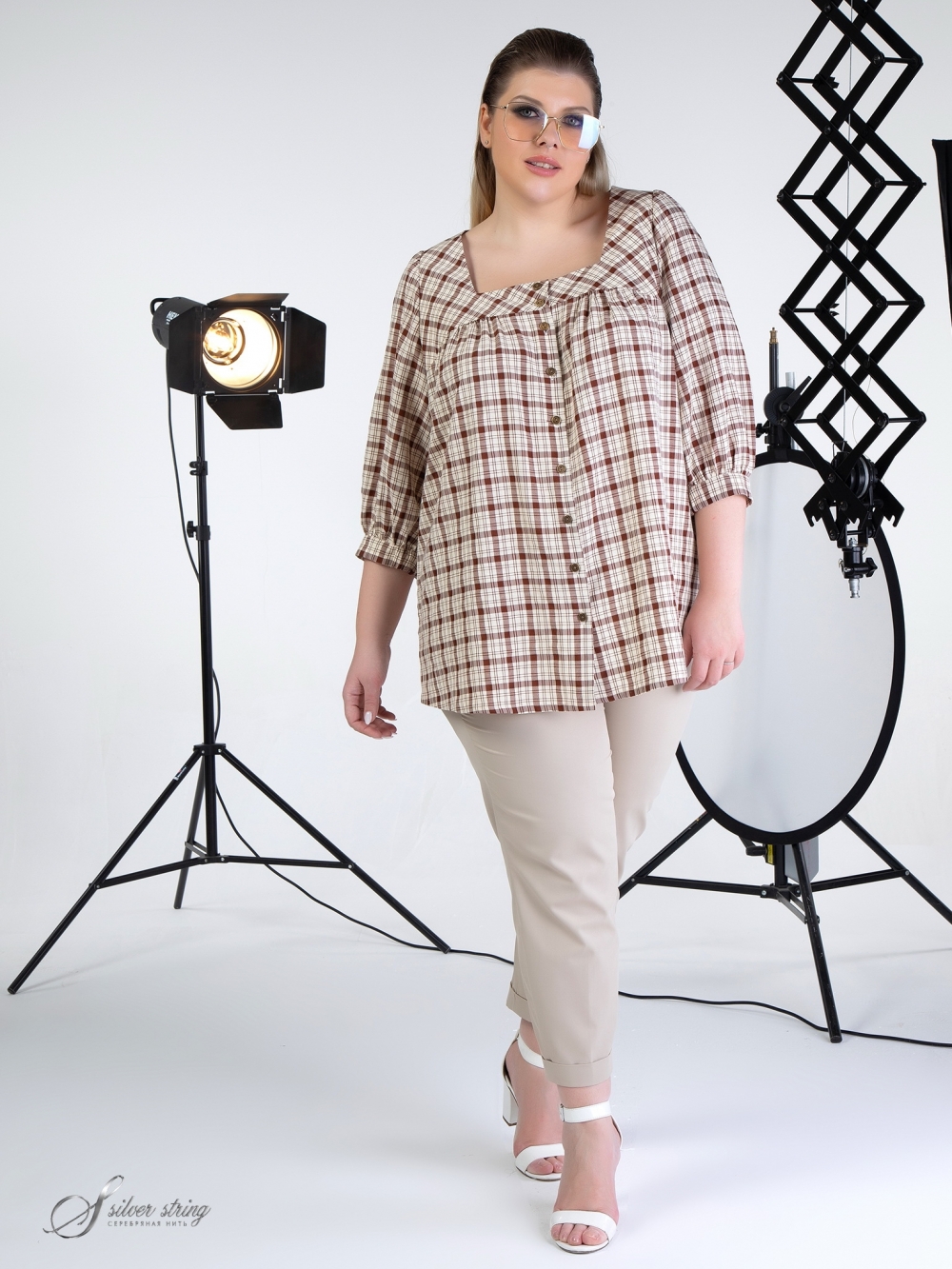 Женственная блуза свободного силуэта выполнена из натуральной ткани с рисунком в клетку. Модель распашная, с модным вырезом «каре» и застежкой на пуговицы. Рукав втачной, объемный, длиной 3/4. Низ рукава присобран на манжету. Для удобной фиксации на руке в манжете закреплен фрагмент эластичной резинки. На полочке и спинке обработаны отрезные кокетки, рисунок на которых расположен «по косой». От кокеток заложена легкая сборка. Натуральная ткань и удобный крой обеспечивают изделию легкость и комфорт в жаркое время года. Модель отлично маскирует проблемные зоны.