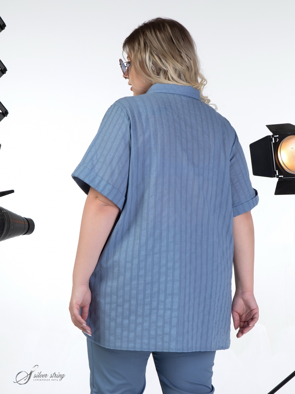 Современная блуза-рубашка прямого силуэта, изготовлена из фактурной однотонной хлопковой ткани. Модель с втачным рукавом длиной до локтя. Воротник рубашечный на стойке. По борту расположена застежка на пуговицы. В боковых швах обработаны разрезы скругленной формы. Модель олицетворяет собой притягательность спортивного стиля в современном звучании.