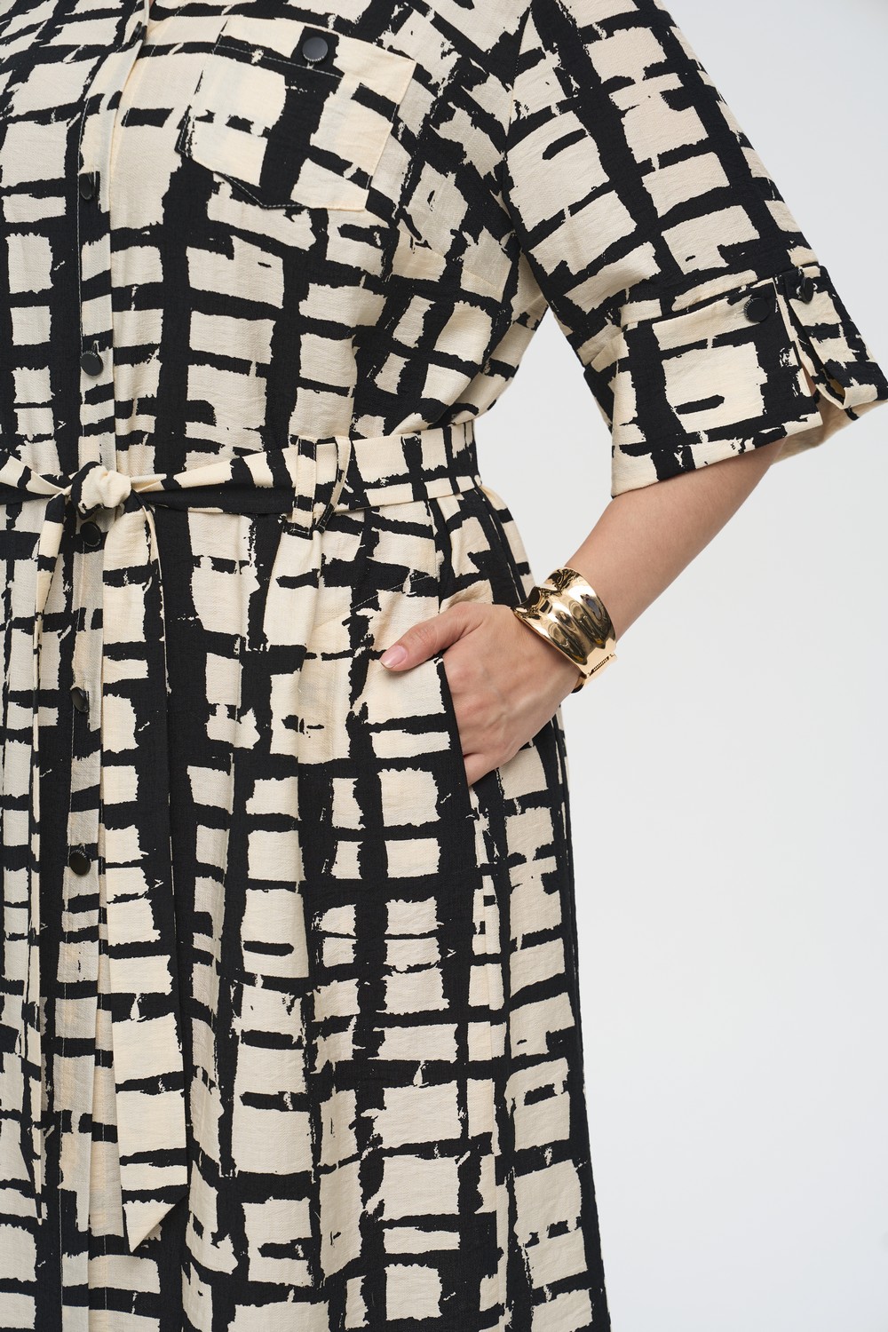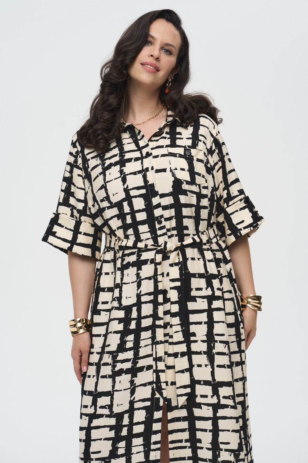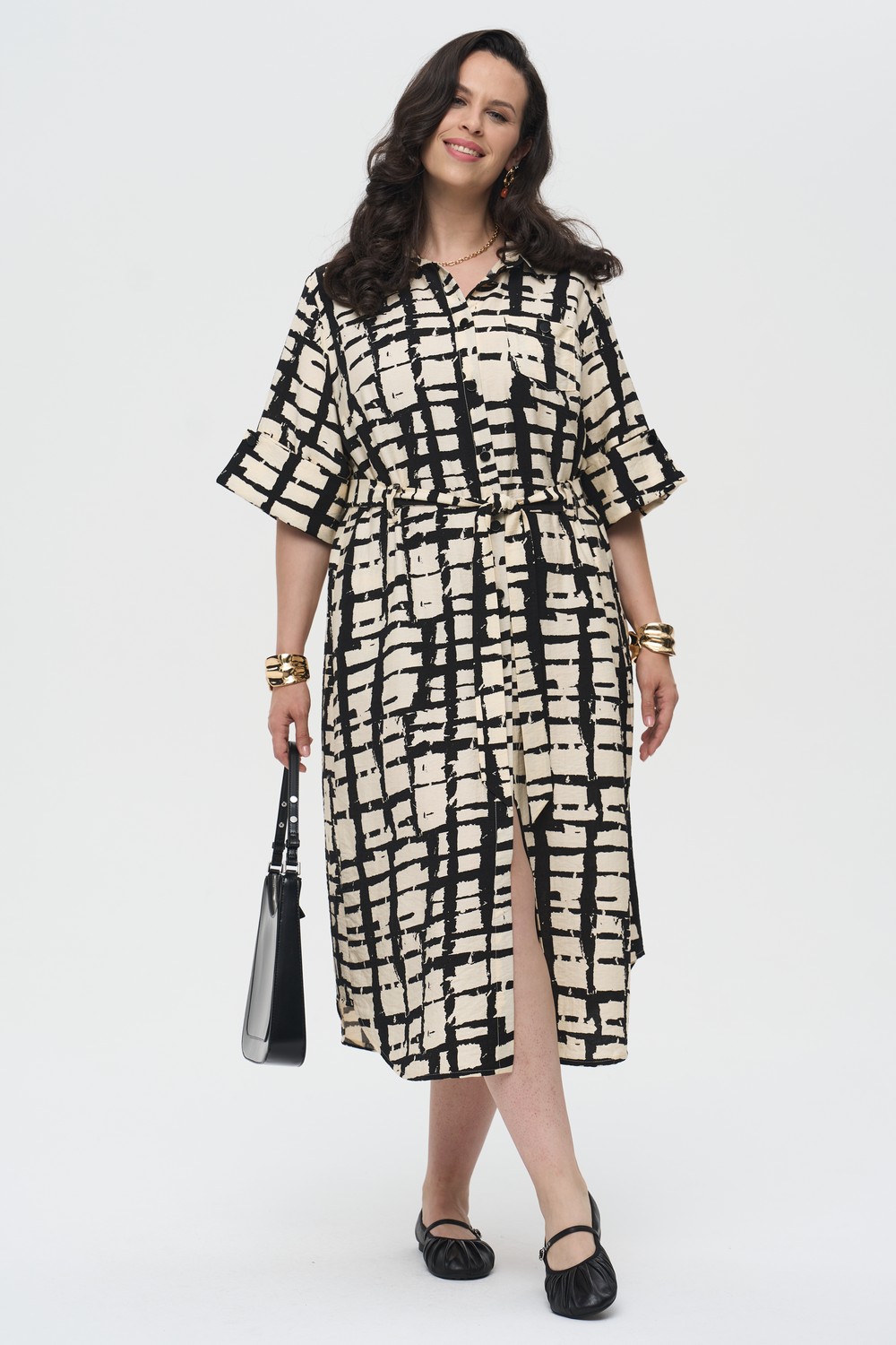Эффектное платье-рубашка прямого силуэта выполнено из легкого смесового полотна на основе вискозы и нейлона с деликатным жатым эффектом. Модель украшена графичным принтом в клетку, который придает образу динамичность и современный вид. Свободный крой в сочетании с функциональными деталями делает это платье идеальным выбором для летнего гардероба, позволяя носить его как самостоятельное изделие или в качестве легкого верхнего слоя.