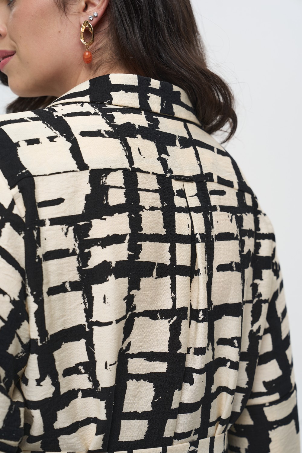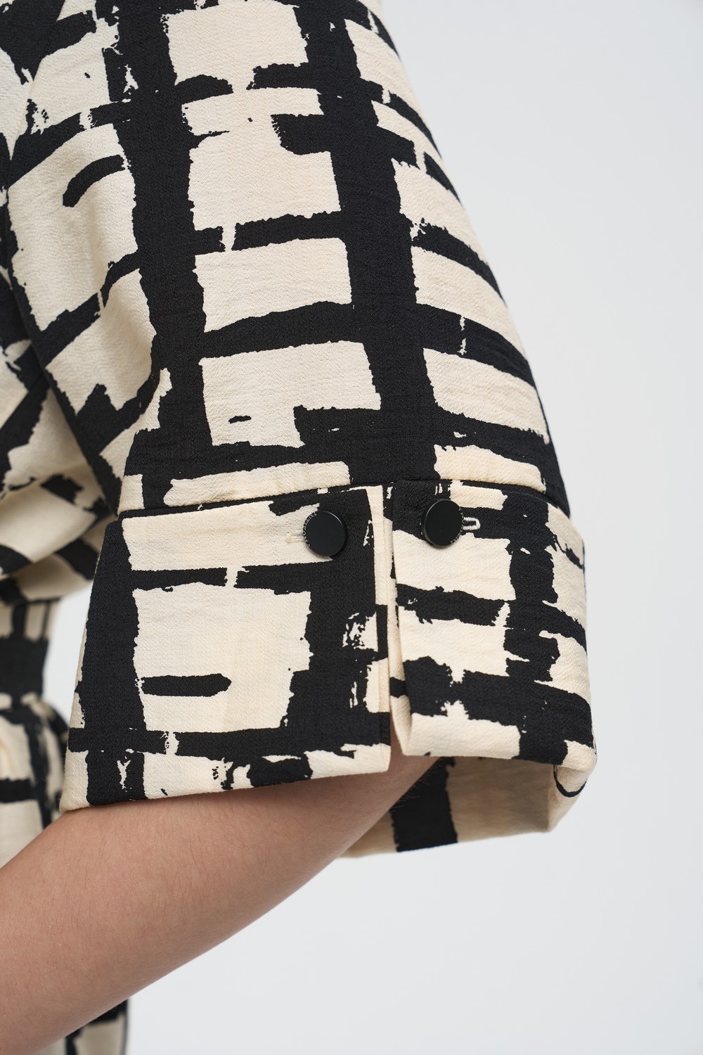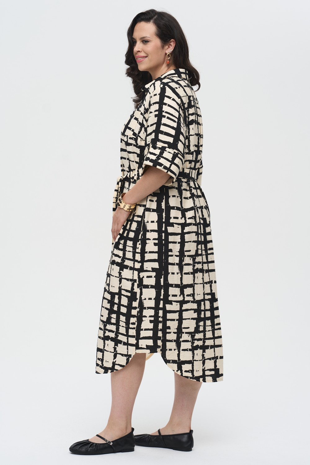 Эффектное платье-рубашка прямого силуэта выполнено из легкого смесового полотна на основе вискозы и нейлона с деликатным жатым эффектом. Модель украшена графичным принтом в клетку, который придает образу динамичность и современный вид. Свободный крой в сочетании с функциональными деталями делает это платье идеальным выбором для летнего гардероба, позволяя носить его как самостоятельное изделие или в качестве легкого верхнего слоя.