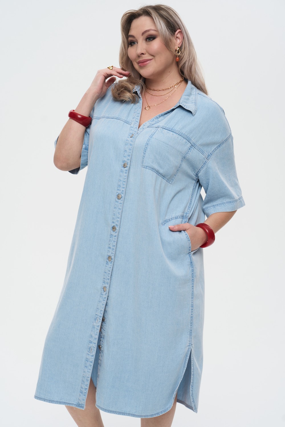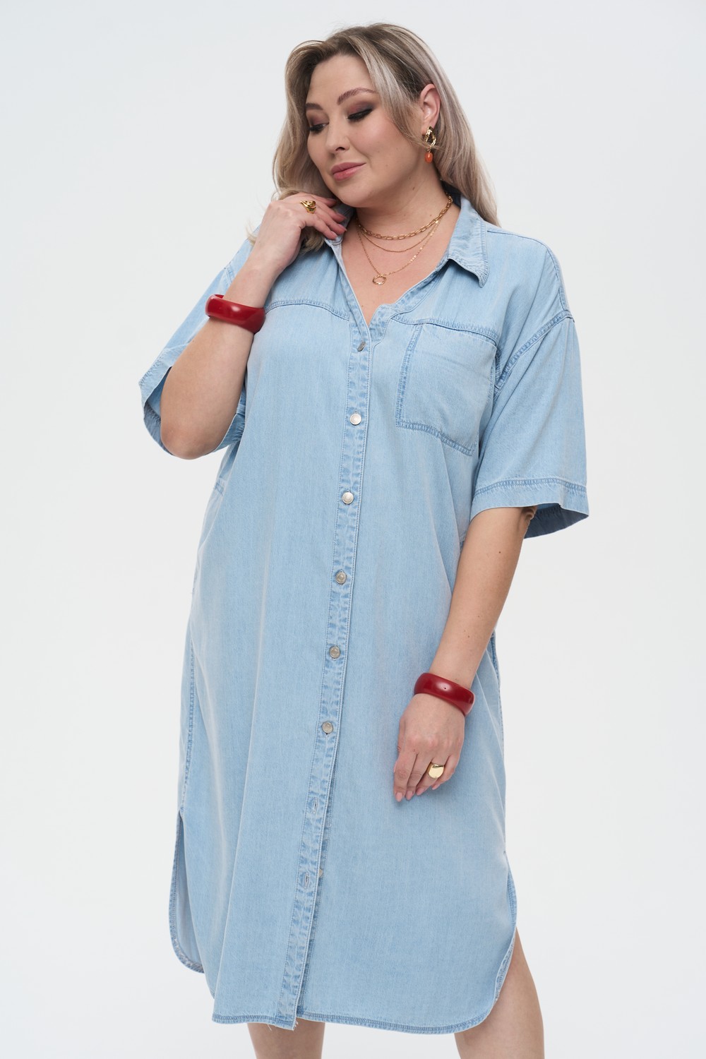 Стильное платье-рубашка из денима в нежном голубом цвете — универсальное решение для создания актуальных и комфортных образов в стиле casual. Модель выполнена из мягкого смесового полотна, в составе которого хлопок и тенсел. Благодаря такому сочетанию материалов изделие отлично пропускает воздух, обладает высокой износостойкостью и очень приятно к телу.